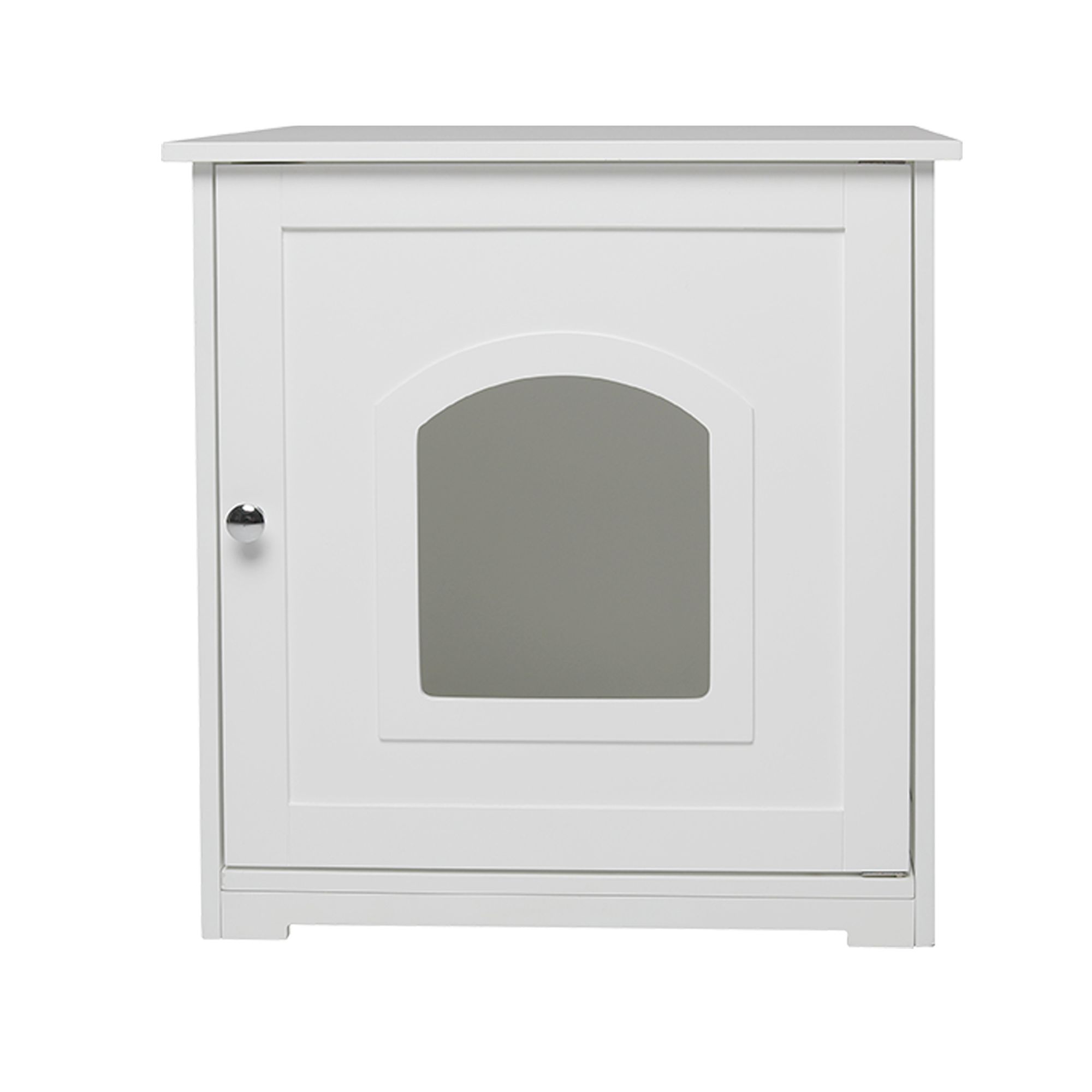 Multi–functional design works as both a litter box enclosure and a pet house; includes a shelf and stainless steel towel bar for storage and décor; complements any home interior.