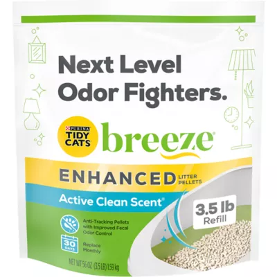 Enjoy improved cat litter box odor control with this Purina Tidy Cats BREEZE enhanced cat litter pellets refill. Designed for use with the Tidy Cats BREEZE litter system (sold separately), these innovative litter box pellets have an Active Clean Scent to control fecal odor on contact, making it easy to keep your cat' environment smelling fresh and clean. Purina's anti-tracking pellets permit your cat' urine to pass through while solid waste remains on top for quick and easy scooping. The 99.9% dust-free scented cat litter formula allows for a clean pour when refilling your BREEZE system. Ideal for multiple-cat households, these pellets offer better odor control than original BREEZE pellets to help you maintain a fresh-smelling home. Purina is so confident in their BREEZE odor control cat litter enhanced pellets that they back up your purchase with the risk-free Tidy Cats Guarantee.