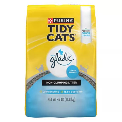 Description: Control tough litter box odors in your multiple–cat household using Purina Tidy Cats with Glade Clear Springs non–clumping cat litter. The non–clumping litter formula makes cleaning your cats' litter boxes a quick, simple task, and the integrated odor erasers help neutralize strong ammonia, fecal and urine smells. With the Glade Tough Odor Solutions technology, this scented cat litter defends against unpleasant odors, leaving every litter box in your home smelling fresh and clean. The Clear Springs scent adds a light, welcoming fragrance sure to delight you and your feline friends, and the multi cat litter formula is ideal for your entire cat family. Keep your cat companions happy and willing to use their litter boxes when you use this Tidy Cats cat litter non–clumping solution, and show them just how much you care about tending to their unique personal needs.