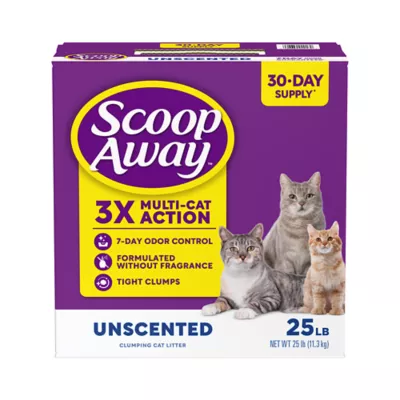 Description: Scoop Away Unscented Clumping Cat Litter is designed with 3X multi cat action that provides 7 day odor control, is super absorbent, and forms tight clumps for multi cat households. Get powerful odor control that handles litter box odors for 7 days guaranteed (1). This 3X Multi Cat Action clumping clay is formulated without added fragrance and forms ultra strong clumps to make scooping the cat litter box fast and easy. Fortified to block ammonia odors, this unscented cat litter neutralizes unwanted litter box smells for a whole week. Plus, low dust formula helps keep the cat litter box area clean. (1) Original receipt⁄barcode cut from box required. For full terms and instructions go to the Scoop Away website. (2) Based on the average purchase cycle.