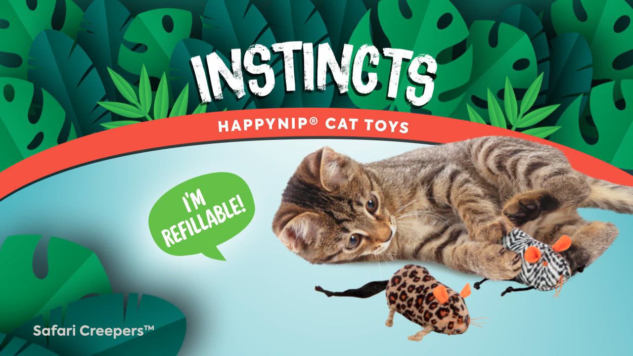 Instincts by SmartyKat Safari Creepers releases your cat's inner instincts with two refillable plush rats that have felt ears, dangling legs, and stretchy tails, mimicking the feel of stunned prey. Perfectly sized to swat, pounce, and kick. This set of 2 refillable Creepers comes with a resealable 2 gm tube of HappyNip Catnip and Silvervine Blend to fill toys right out of the packaging and attract cats to play. Satisfy your cat's hunting instincts with safer and kinder "prey." SmartyKat creates stylish cat products that help pet owners easily meet their cats' emotional, physical, and instinctual needs. Each product is designed to fulfill a particular feline need while fostering a stronger relationship between you and your cat. From scratchers and interactive toys to edible grass and catnip, SmartyKat keeps your feline companion's health, safety, and well-being at the core of everything we make. Giving pet parents the best of all worlds: innovative products, stylish designs, and affordability all in one place, satisfaction guaranteed!