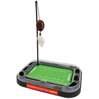 Cats love to scratch and bat, and they love catnip, so you'll score a touchdown when you get your feline friend the Pets First NFL Kansas City Chiefs Football Field Cat Scratcher Toy with Catnip. This premium cat scratcher board has a refillable catnip, plush football with catnip included. Feathers hanging from the football bring an extra allure. The jingling, cat ball bell-toy rolls around the field inside of the cat tracks to drive kitties wild. Extra point! The stick holding the cat basketball and feather cat toys can be removed from the cat scratching post for interactive play.