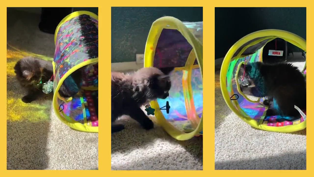 KONG Play Spaces Rave Cave brings the fever to your cat's Saturday nights-or any night or day! The crackling floor entices full-body kitty breakdancing, as motion-activated 90s techno beats start pumping and retro lights begin flashing, enticing your cat's multiple senses. A shiny disco ball hangs from the ceiling, inviting batting & boogying. When the party's over, easily fold up this tunnel and pack it away until it's time to drop it like it's hot again. Energetic cats will love this interactive tunnel for batting, stalking, pouncing, and partying. On/off switch gives kitties an option for silent and dark disco nights.