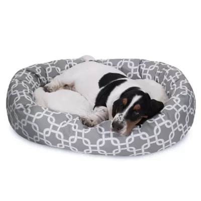 DESCRIPTIONThe Links Sherpa Bagel Bed by Majestic Pet provides superior comfort for your dog. This bed makes a fashion statement in any room, the bolster is made of a durable 7 oz. Outdoor treated Polyester with water & stain resistance and a Sherpa center cushion. The bed is filled with Super premium High Loft Polyester Fiber Fil, which ensures a snug rest anywhere in the house. To keep the bed safe from accidents or spills, the base is made of a heavy duty, water proof 300/600 Denier. Our bagel beds are easy to clean - just place the entire bed in the washer on gentle cycle and air dry. 40-inch and 52-inch beds feature a removable zippered slipcover for easy care.