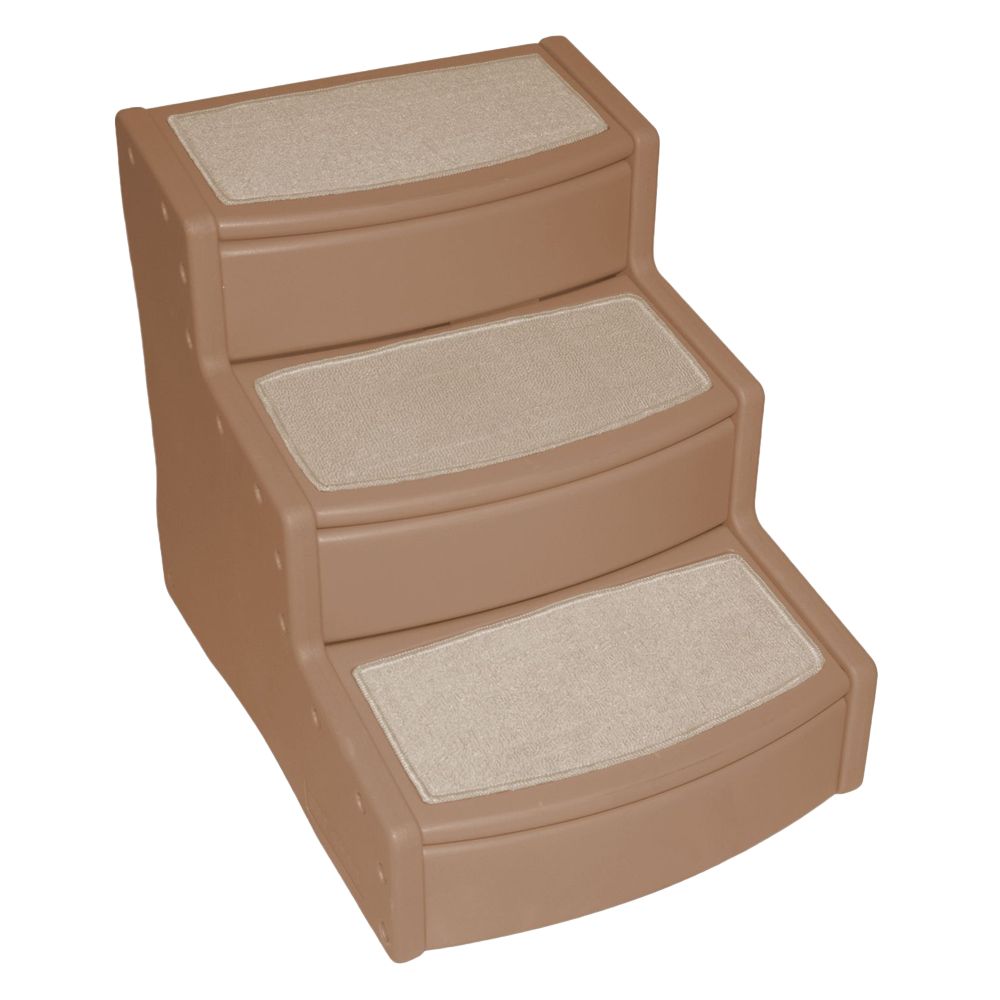 The Easy Step III Pet Stair has wide, deep steps to give smaller dogs the ability to get their entire body on each platform and large dogs the ability to comfortably climb the stairs. The innovative incline of each step reduces the amount of stairs needed to climb eliminating stress on your pet. The carpet tread removes easily and is machine washable. The stair easily snaps together (no tools required). Made of HDPE Plastic.