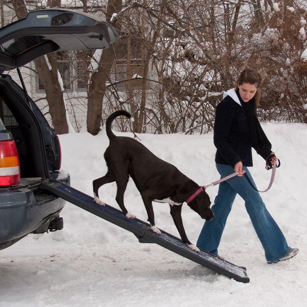 The Pet Geat Tri-Fold Pet Ramp allows your dog easy access into your vehicle or other hard to reach places. The tread is skid-resistant even when wet to keep your dog steady, while the bottom of the ramp has rubber grippers to maintain its position. Meanwhile, its Tri-Fold design reduces the space required for storage and has a carry handle for easy transportation.