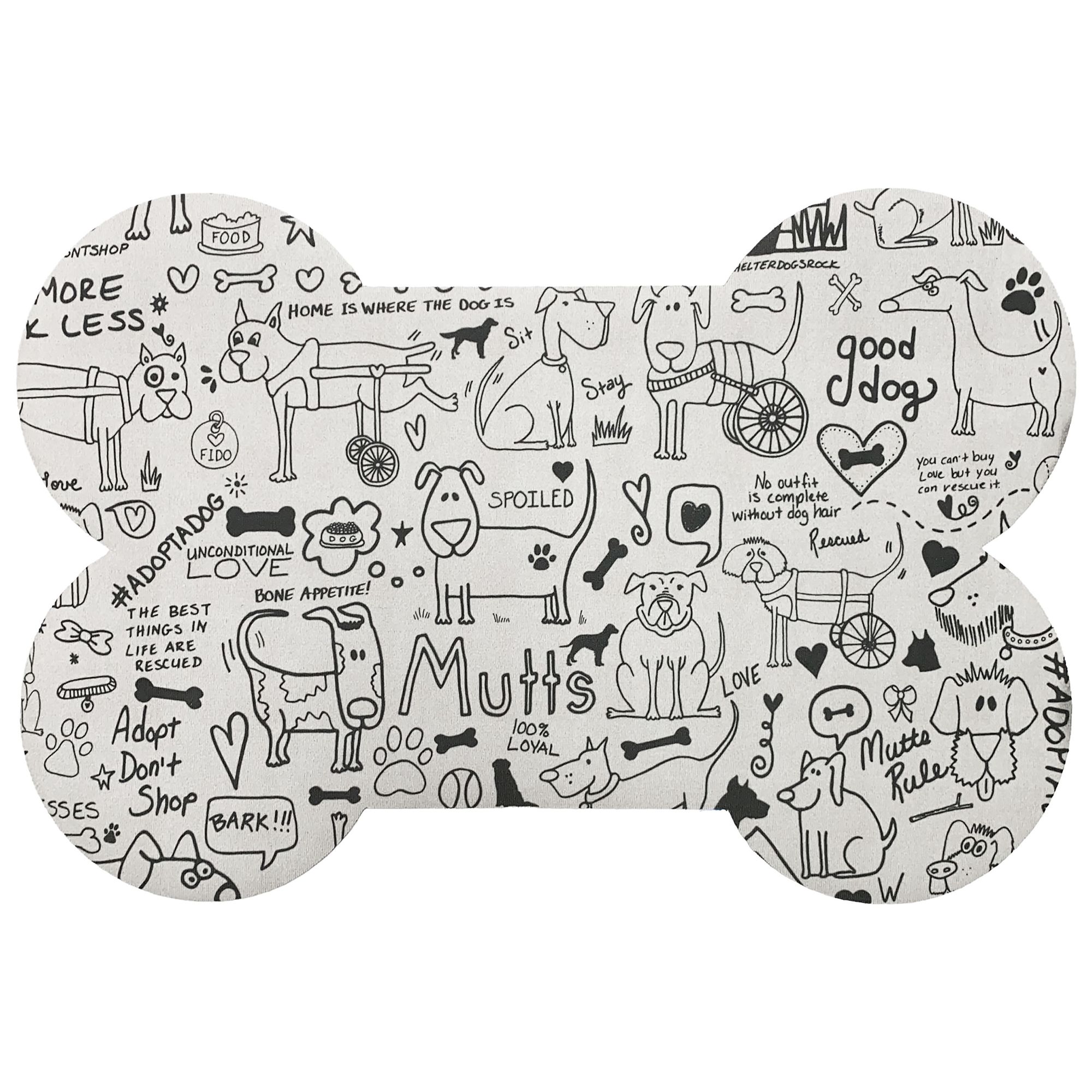 Description: Fido's food area never looked so tidy and dapper! These stylish dog bowl mats are as functional as they are adorable. Designed to help keep your floors clean and dry, and machine washable for when Fido gets a little messy. Beautiful, high–resolution printed designs. Knitted polyester surface with a durable rubber backing to help it lay flat and stay in place. Machine washable (gentle) and dryable (on low or air dry).Proudly made in the USA Recommended for indoor use only. Washable, Non–Slip, Adorable