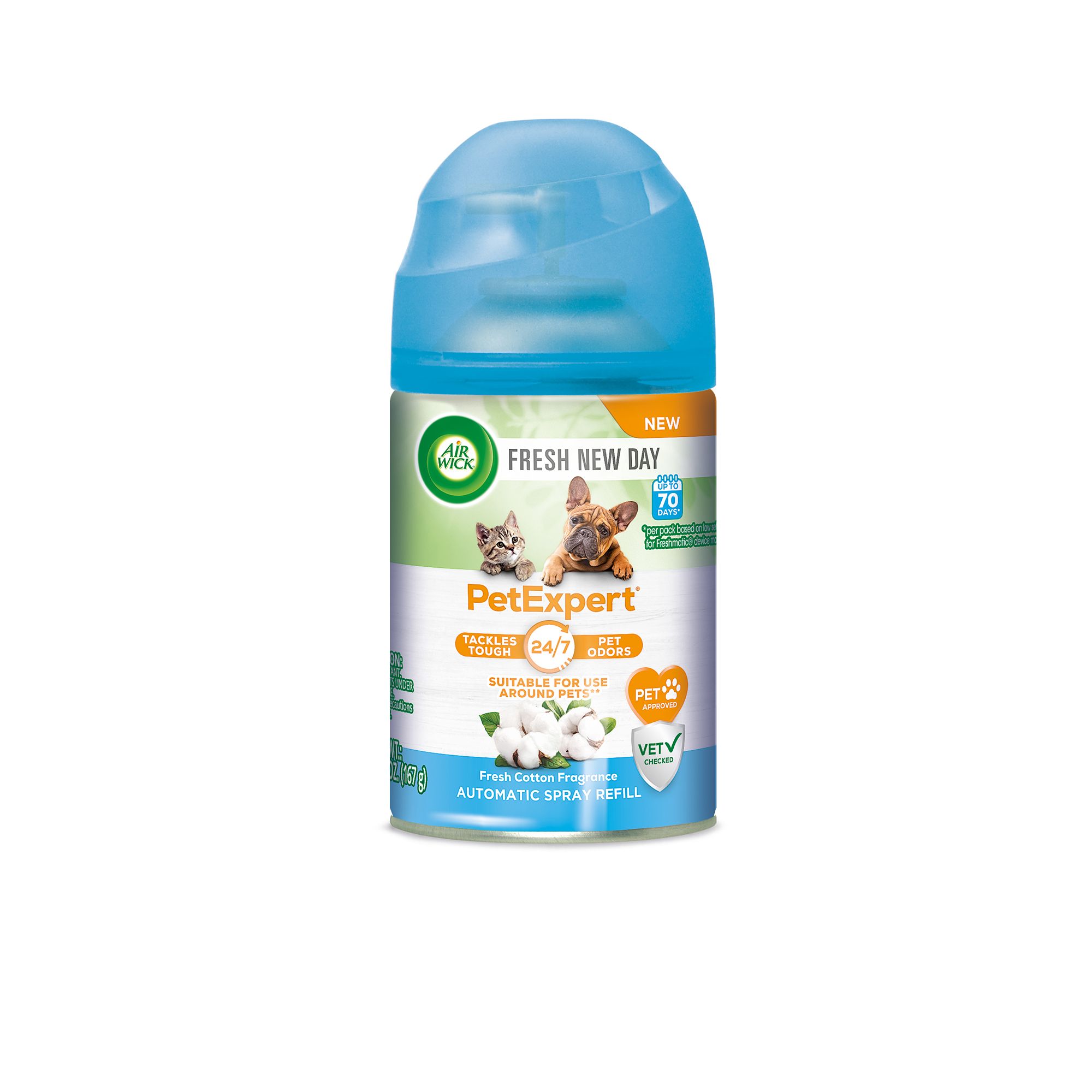 The Air Wick Pet Fresh Scent Automatic Spray Starter Kit offers 24/7 Pet Odor Neutralization. Its fragrance lasts up to 70 days (based on low setting for Freshmatic device model RB066), and is infused with natural essential oils, free from acetone and phthalates for optimal pet odor neutralization.