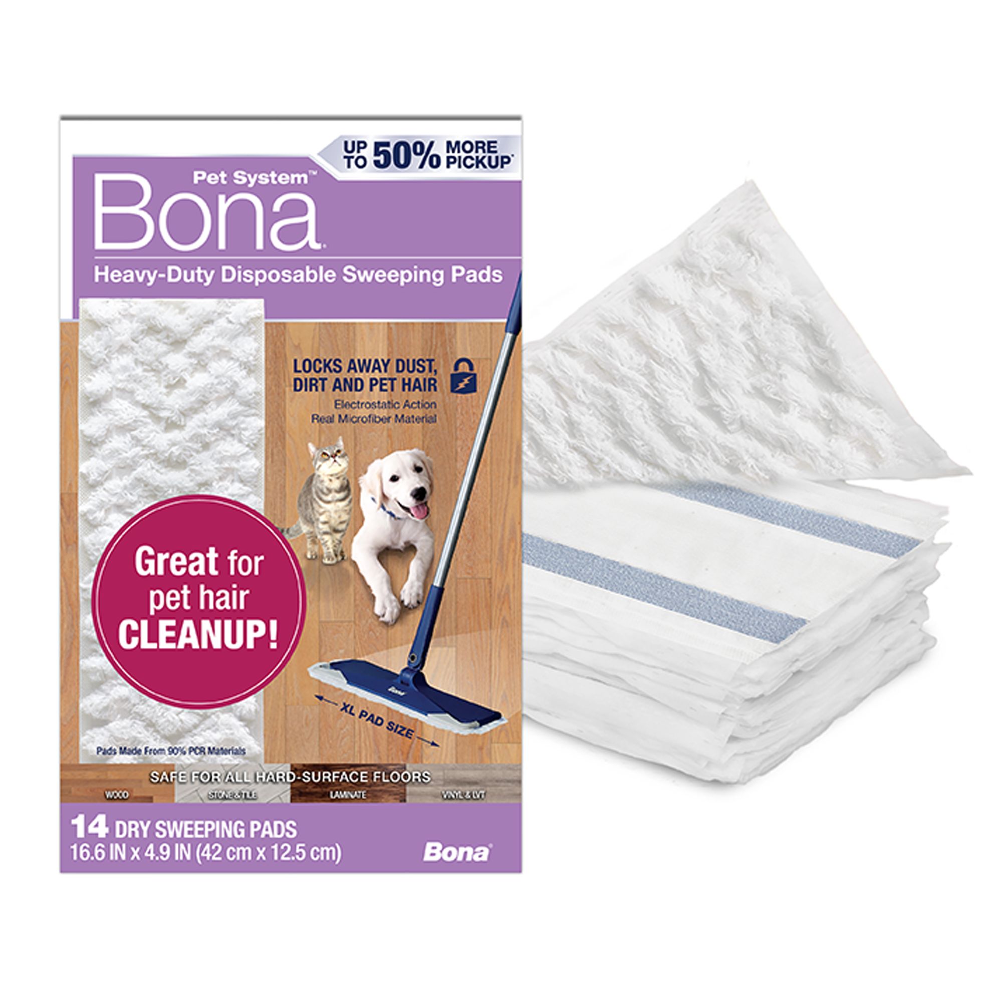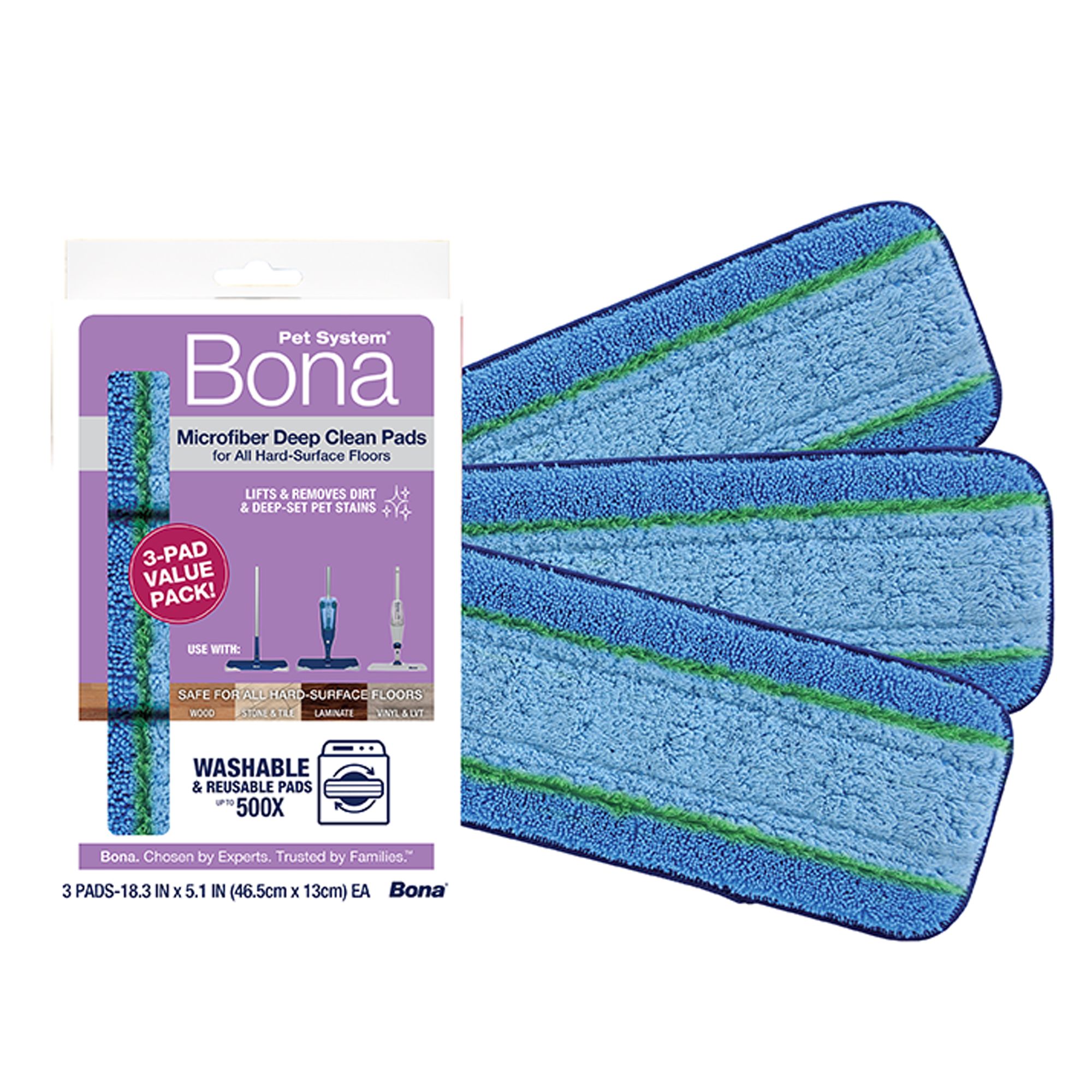 The Pet System Microfiber Mop includes the Bona Pet Sweeping Pad that works through Electrostatic Action and specially designed microfiber "fingers" that pick-up hair, pet fur, dander and allergens. Also included, the Bona Microfiber Deep Clean Pad made with patented PowerLoop Technology that gently breaks apart and loosens tough dirt build-up, while dual-zone microfiber traps dirt away. Both Bona Microfiber Pads can be washed & reused up to 500 times.