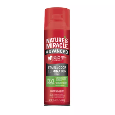 Accidents happen, as every dog owner knows. Natureâs Miracle Advanced Stain & Odor Eliminator Foam for dogs is an enzymatic, severe-mess stain and odor remover that helps discourage re-soiling by removing the odor of even the toughest dog messes. The foam spray penetrates down into carpet to power out severe pet messes such as, urine, feces and vomit. Patented microbes target tough pet odors. When used as directed, this product is safe to use around your pets and in your home.
