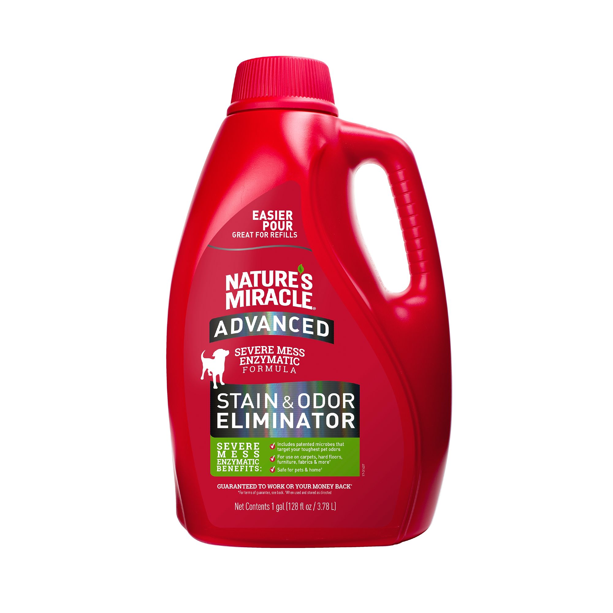 Accidents happen, as every dog owner knows. Natureâs Miracle Advanced Stain & Odor Eliminator Foam for dogs is an enzymatic, severe-mess stain and odor remover that helps discourage re-soiling by removing the odor of even the toughest dog messes. The foam spray penetrates down into carpet to power out severe pet messes such as, urine, feces and vomit. Patented microbes target tough pet odors. When used as directed, this product is safe to use around your pets and in your home.