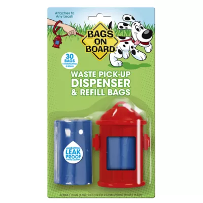 This Bags on Board Fire Hydrant Dispenser makes picking up after your dog easy and convenient. This sturdy and compact dog poop bag dispenser holds 15 large dog poop bags, and when it's time to refill, simply pop off the top and reload. It attaches easily to most standard or retractable leashes so you'll always have a poop bag when you need it, and one with double-sealed seams to make it stronger, leak-proof, and tough enough to handle the bigger jobs.