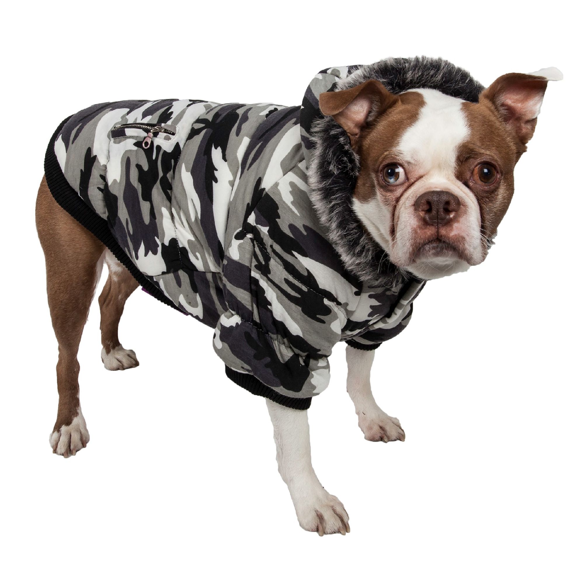 Fashion meets function with Hip Doggie's Vintage Bomber Jacket. This cool vintage bomber jacket features a detachable fleece-lined hood with a drawstring for a perfect fit. The hood zips off with a hidden zipper for two great looks, and comes with distressed faux leather for that classic look. Toggles on the waist offer a snug fit, while a leash keyhole makes for easy collar attachment. Prices vary by size.