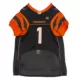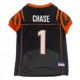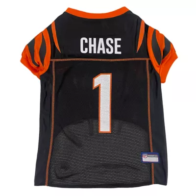 Let your four-legged friend show some love for her favorite football team with the Pets First NFL Player Ja'Marr Chase Dog Jersey. She'll be ready for game day in this jersey which features the official team colors, team name and number on the back and the team logo on the front. Made from satin and breathable poly mesh, this jersey is comfortable, durable and stylish. It also has sporty stripes on the sleeves just like the pros! The NFL "property of" jock tag allows you to add a touch of style and personalization, because win or lose, she'll still be your MVP - Most Valuable Pet, that is!