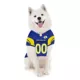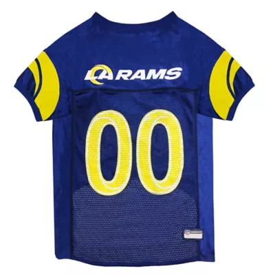 Let your four-legged friend show some love for her favorite football team with the Pets First NFL Player Los Angeles Rams Dog Jersey. She'll be ready for game day in this jersey which features the official team colors, team name and number on the back and the team logo on the front. Made from satin and breathable poly mesh, this jersey is comfortable, durable and stylish. It also has sporty stripes on the sleeves just like the pros! The NFL "property of" jock tag allows you to add a touch of style and personalization, because win or lose, she'll still be your MVP - Most Valuable Pet, that is!