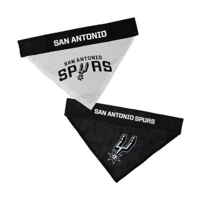 DESCRIPTION Get your favorite tail-gating buddy in the spirit for game day with this Pets First San Antonio Spurs Reversible Dog Bandana. The dual-sided accessory is made of a poly-cotton blend and features an embroidered team logo on one side and mesh with a screen-printed team name and logo on the other for a great look.