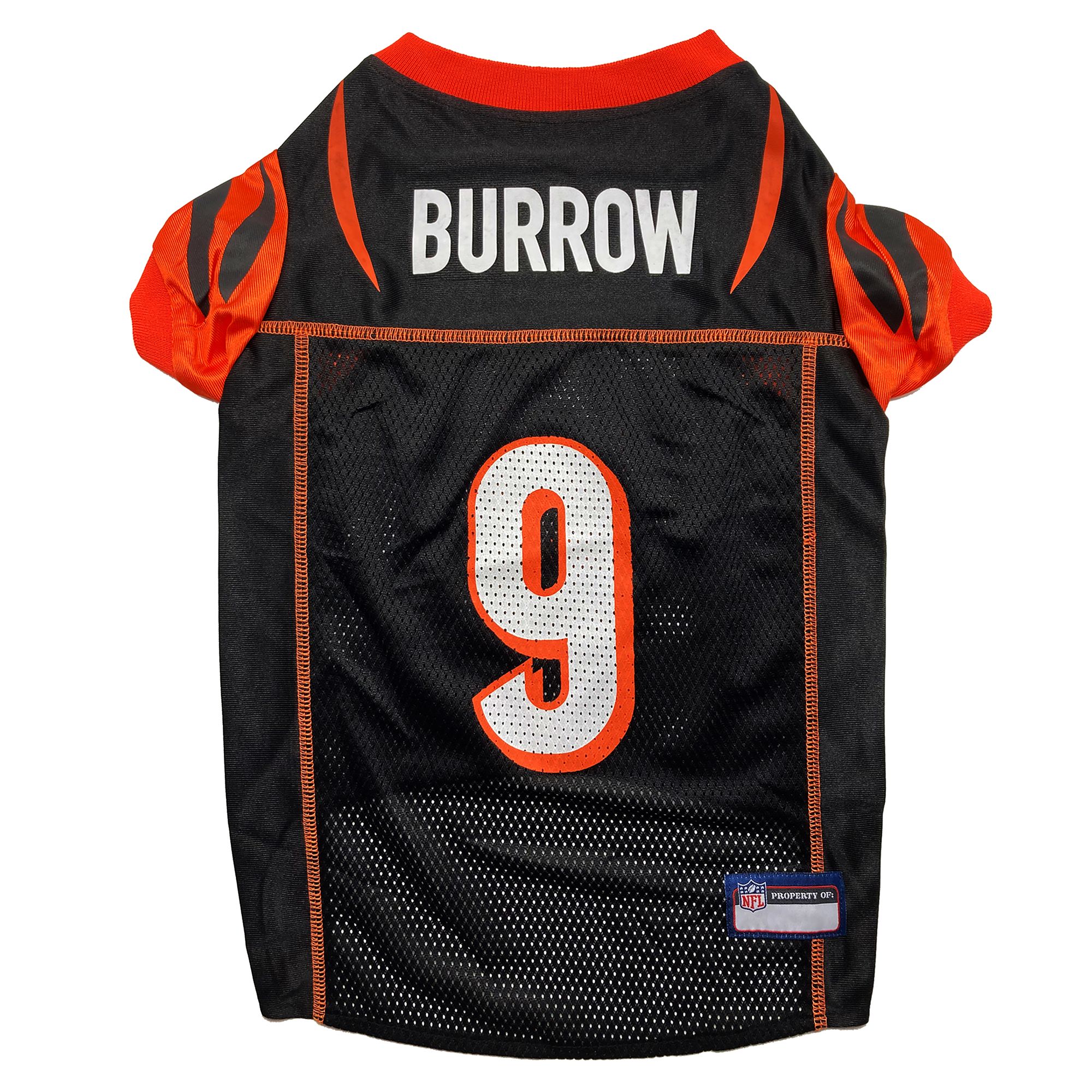 Let your four-legged friend show some love for her favorite football team with the Pets First NFL Player TJ Watt Dog Jersey. She'll be ready for game day in this jersey which features the official team colors, team name and number on the back and the team logo on the front. Made from satin and breathable poly mesh, this jersey is comfortable, durable and stylish. It also has sporty stripes on the sleeves just like the pros! The NFL "property of" jock tag allows you to add a touch of style and personalization, because win or lose, she'll still be your MVP - Most Valuable Pet, that is!