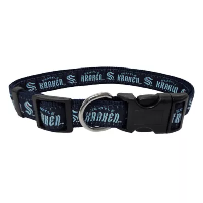 Let your pet show off their team spirit with the Pets First Seattle Kraken NHL Dog Collar. This stylish NHL dog collar features your favorite team's name and logo sewn on to the collar. The nylon web collar is adjustable and proudly displays your team's colors. It has a snap-lock plastic buckle that makes it easy to put on and take off as well as a silver D-ring to attach a lead.