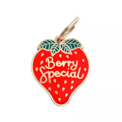 Description: The Berry Special Pet ID tag lets all the other dogs know that this is no ordinary dog. This dog was built different. With a little extra somethin' somethin'. A certain Je no sais quoi. But its real. For the dogs who is like strawberries on a summer evening, I don't know if you could ever go without the Berry Special Pet ID tag. This brass tag features gold plating so your pup's style is always fresh. Can be customized with up to four lines of text on the backside. Our laser–engraving is guaranteed to last so your pup's way home will never rub off. Engrave ID information with up to 4 lines of text on the backside so your bestie will always find their way back home.