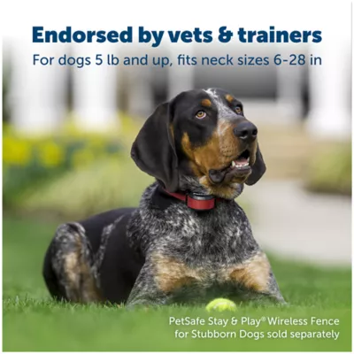 DESCRIPTION The PetSafe Stubborn Dog Stay & Play Wireless Fence Receiver Collar is designed for stubborn or hard-to-train dogs that require a higher level of intensity. It can be used to add another dog or as a replacement collar for the Stay & Play Wireless Fence or the PetSafe Wireless Pet Containment System. This rechargeable collar features 5 levels of static correction plus a tone-only mode for training. Trust PetSafe to help keep your pet healthy, safe and happy.