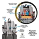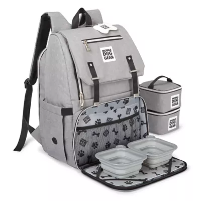 Mobile Dog Gear's Ultimate Week Away Backpack will allow you to conveniently pack and organize your dog's belongings for long or short trips. Our travel dog bag comes with two 5-cup lined food carriers for food and treats and two 2-cup collapsible silicone dog bowls that zips up with the placemat on the front of the bag. Features include: Side pockets, zippered inside mesh pocket, mesh pocket in front compartment, adjustable padded straps, built in waste bag dispenser, and large zippered drop-down storage compartment located in the back of the bag. The convenient waste bag dispenser is located at the bottom side of the bag, so you can simply reach around while walking and grab the waste bags and you are good to go. Our travel bag for dogs also meets airline carry-on requirements and features a bone shaped luggage ID tag and a luggage strap that fits over pull-up suitcase handles. The backpack is perfect for carrying essentials such as water bottles, dog toys, doggy waste bags, leash and can even fit a dog blanket! Our dog travel backpack has a polyester exterior that is resistant to tearing and ripping. The interior is fully lined and easy to keep clean. The backpack and food carriers are hand washable and the silicone bowls are top rack dishwasher safe.