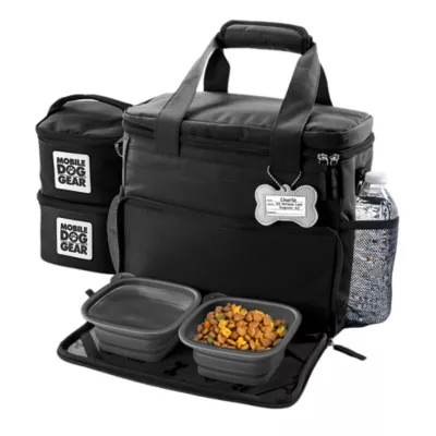 The Mobile Dog Gear Week Away Bag for Small Dogs, under 25 lbs, is the perfect size for packing your pet's belongings for up to a week away. Included with your bag are two 5-cup lined food/treat carriers, two 2-cup collapsible silicone bowls and a non-stick placemat that store conveniently in the front flap. This highly functional Week Away bag for small dogs features a large main compartment, front drop-down section, divider for food carriers, inside mesh pocket, adjustable padded shoulder strap, and two side mesh pockets. Additionally, this travel bag also meets most airline carry-on requirements and features a luggage sleeve that fits over a suitcase pull up handle and an ID luggage tag.