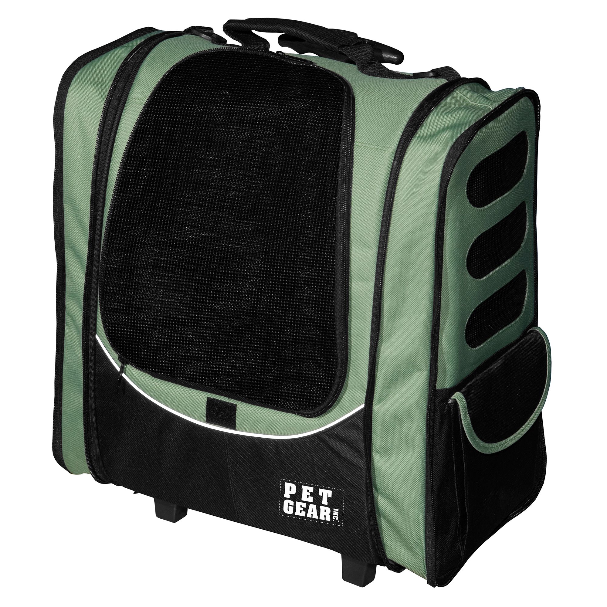 The five-in-one Pet Gear I-GO-2 Traveler Pet Backpack Carrier features a telescoping handle with wheels to function as a rolling case. It may also be used as a backpack, tote or car sear, and includes a zippered pocket to carry along some extras.