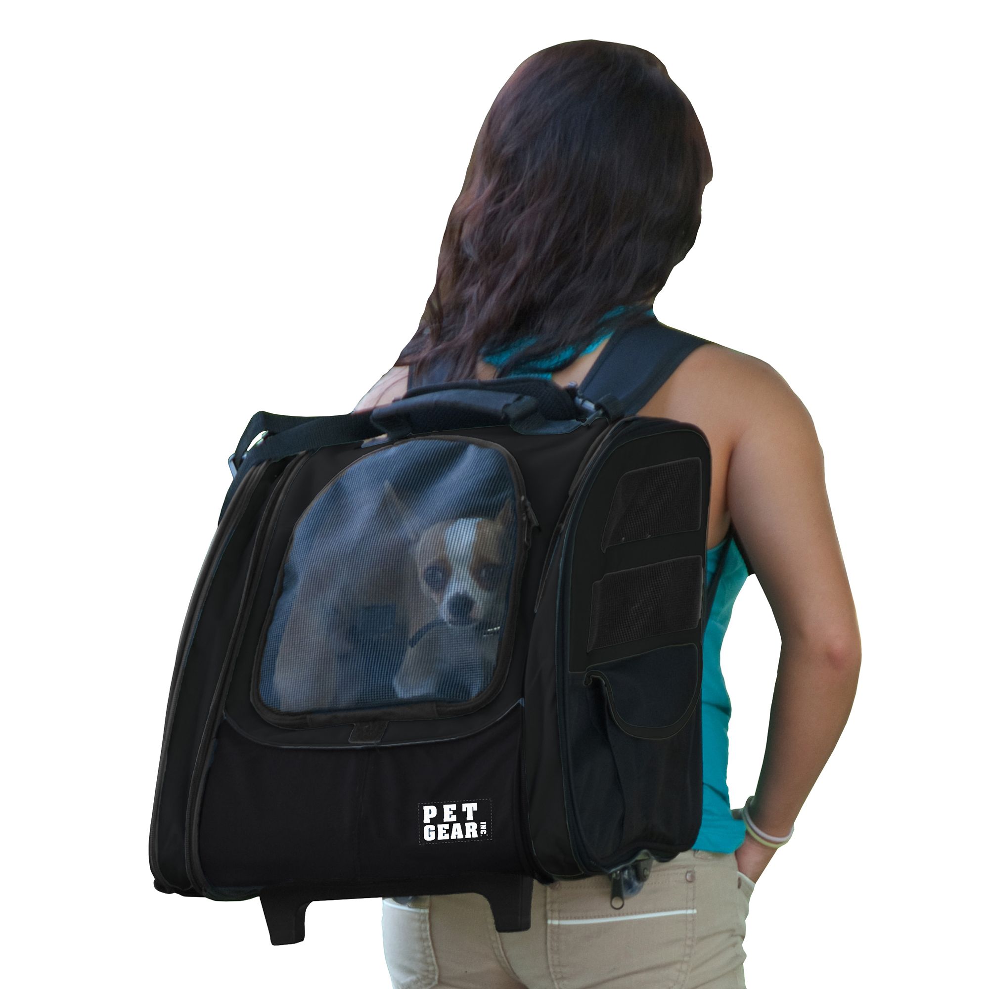 The five-in-one I-GO2 Plus Traveler has telescoping handle with wheels, to function as a rolling case. Can be used as a backpack, tote, carrier, or car seat. Comes with removable plush pad for easy washing, tether to secure animal, and wheel cover. If the pet fits the dimensions of this product comfortably when the product is fully assembled, the product will support the weight of the pet. For small pets only. Read sizing dimensions of product carefully. Made in polyester, mesh & steel.