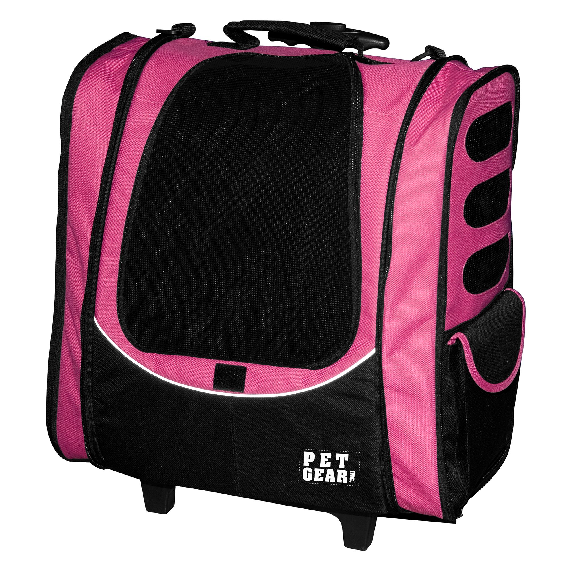 The five-in-one Pet Gear I-GO-2 Traveler Pet Backpack Carrier features a telescoping handle with wheels to function as a rolling case. It may also be used as a backpack, tote or car sear, and includes a zippered pocket to carry along some extras.