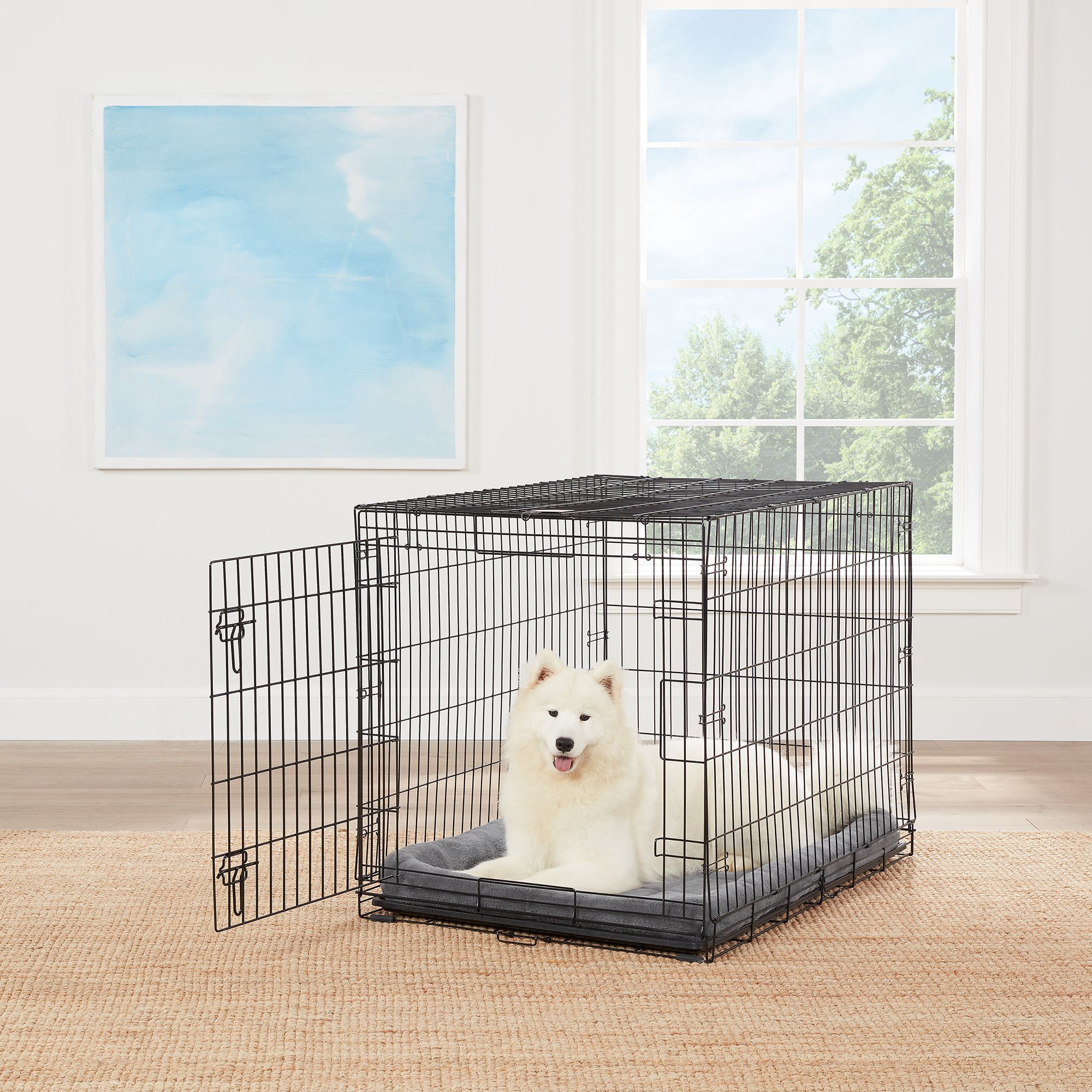 This KONG Ultra-Strong Two Door Crate is designed for durability and provides a safe and secure environment for your dog through every stage of life. Perfect for training during the early stages of companionship, the crate later transforms into a personal den-like space for your adult dog. The unique, reinforced doors feature angled locking tips and paw blocks on the slide-bolt latches to give added confidence that your dog will be safely contained. Only at PetSmart.