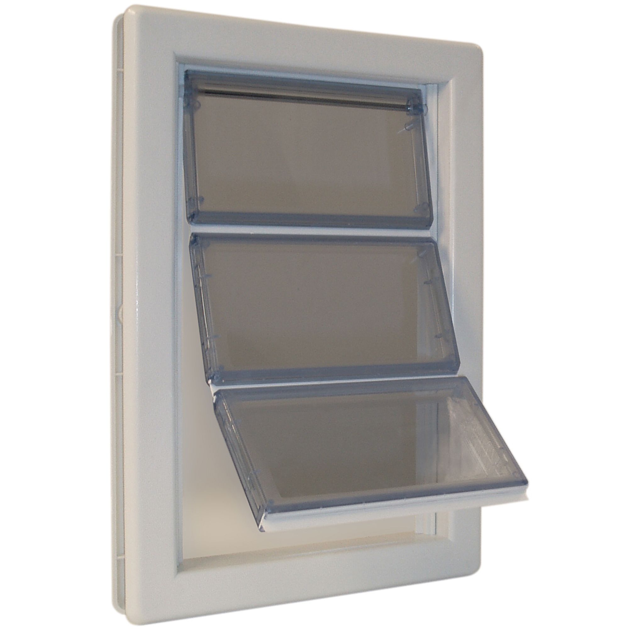 Sturdy thermoplastic (ABS) frame; a see through poly vinyl flap with patented edges to not warp; a floating sill to insure good closure; and a strong molded ABS lock-out slide to restrict the pet's movements when necessary.