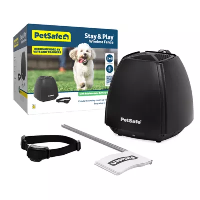 The PetSafe Stay & Play Wireless Fence with Replaceable Battery Collar covers a circular area up to 3/4 acre with no trenches to dig or wires to bury at a fraction of the cost of a traditional physical fence. The fence transmitter is portable for RVs, cabins, and rental houses. Just plug the transmitter into a standard outlet near the area where you want to contain your pet. The transmitter communicates with your pet's waterproof receiver collar and helps keep him in the designated area. The receiver collar is ergonomically designed for comfort and sized for pets weighing 5 pounds or more. Choose from 5 adjustable levels of static correction to find just the right level for your pet, plus tone only mode which warns your pet with a beep. With just a few short training sessions, you'll create a secure boundary for your pet to enjoy freedom and fun! Your pet deserves the best. Trust PetSafe to keep your pet healthy, safe and happy.