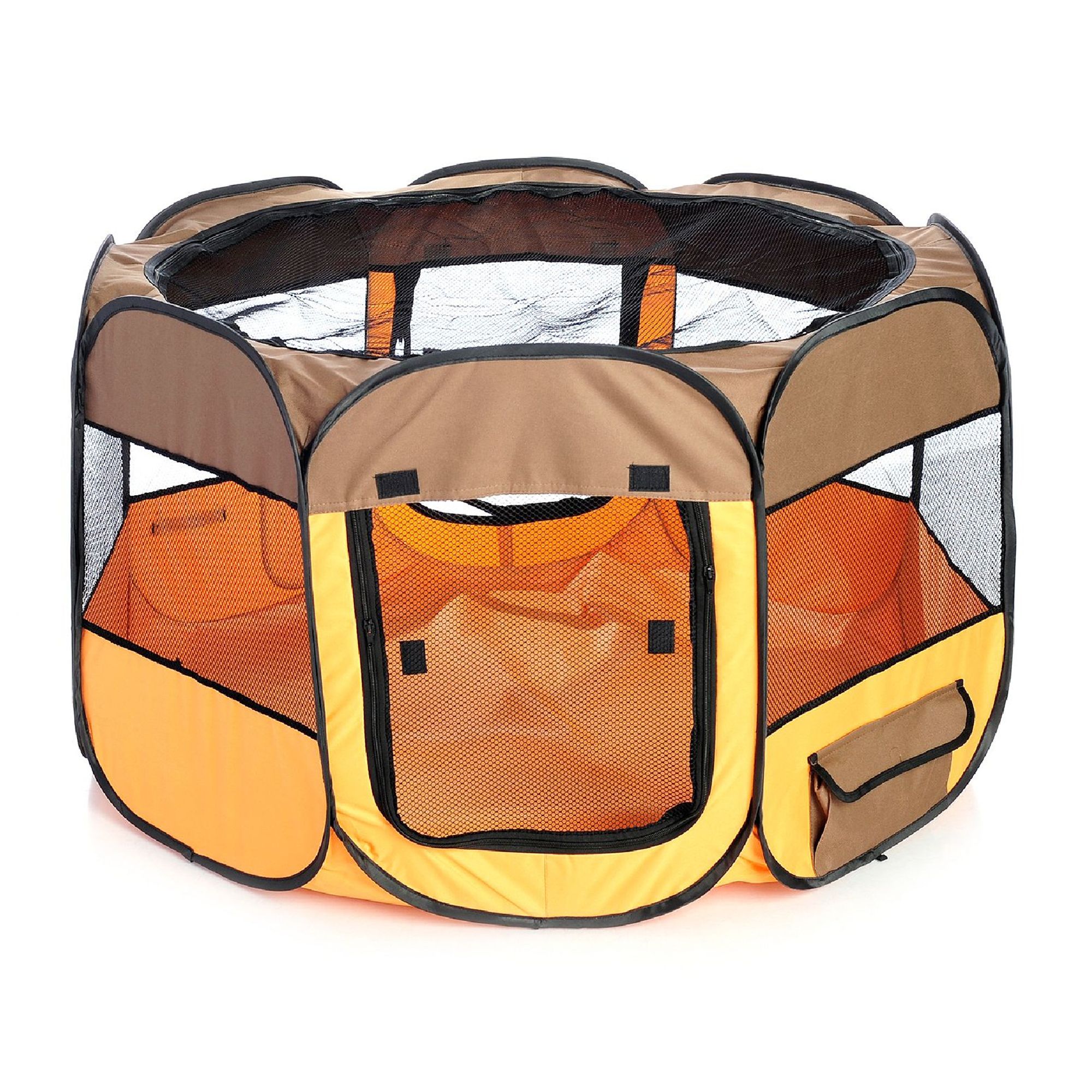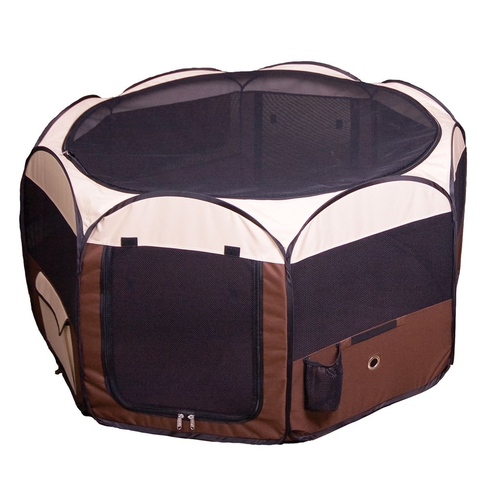 The new Armarkat model PP003BGE-XL portable playpen is perfect for kittens, puppies, or a group of playful Chihuahuas. Available in a stunning color combination of black and beige. It has a zip-off top and outside pocket for treats and toys. model PP001B is water resistant and is constructed of extra-strong polyester fabric with mesh vents for visibility and air. With a net weight of 7.7 lbs., the portable playpen is lightweight for outside or indoors, but tough enough for travel. It is also equipped with space for pet care accessories like water bottle holder, water dispensing window, and exterior pocket to keep pet treats like a chewable or toys.