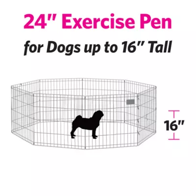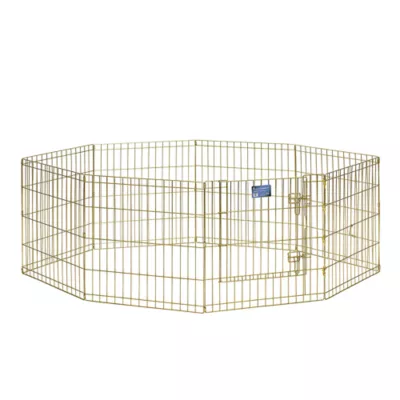 The 24"W x 24"H gold MidWest Exercise Pen provides a secure 16 sq ft enclosure for your pet. Exercise pens by MidWest are easy to set-up with no tools required and come with a convenient door. These exercise pens can latch onto the door of a dog crate to provide your pet with the freedom to move and play while adding the security and comfort of their dog crate. Because life goes
