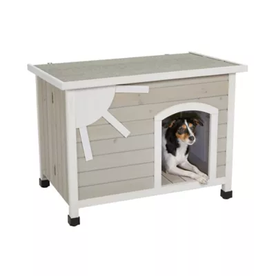 Watch your furry friend's excitement unfold when you unfold his new Eillo Folding Outdoor Wood Dog House from Midwest Homes for Pets! It comes to your door fully assembled - and folded up. Just place this sturdy, waterproof wooden doghouse anywhere on your property, unfold it and presto! Your dog's new house is ready to go! No tools are needed whatsoever. And since the dog house sits on four adjustable legs, you can raise or lower each one as needed to make the dog house level, even on an uneven surface. Plus, its elevated floor allows good air circulation, keeping the doghouse - and your pup - cooler on a hot day. Combine all these amazing features with this product's high quality, and you've got an open-and-shut winner for your best friend.