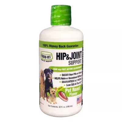 DescriptionLiquid-Vet K9 Hip & Joint Support Formulas contain high levels of glucosamine (1500 mg), MSM, hyaluronic acid, and chondroitin in a single dose and are TASTIER, EASIER TO USE, and FASTER than pill, powder, or chewable form supplements. Liquid-Vet Formulas are the only products available in a choice of natural flavors for picky pets or those pets that may have allergies to specific proteins. Simply dose during meal time once a day with no mixing required. It's that easy.