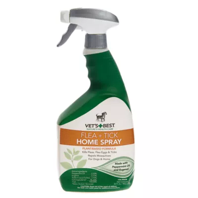 DESCRIPTION Vet's Best Flea & Tick Home Spray benefits from nature's most powerful plant extracts with a unique blend of Peppermint Oil and Eugenol (from clove plants). This blend was carefully formulated to kill fleas naturally and safely. For over 30 years, Vet's Best has blended ingredients that work together to comfort and protect your pet.