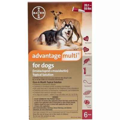 - the 6-in-1 monthly topical solution for dogs 20.1 to 55.0 lbs. Advantage Multi for Dogs not only prevents heartworm disease, but also treats and controls sarcoptic mange and intestinal worms including roundworms, whipworms and hookworms. This layered protection also treats and prevents flea infestations. Packing all of this protection into a single, once-a-month, topical application delivers the ultimate convenience in protection. No need to trick your dog into taking hard-to-swallow pills or wearing a collar with less coverage. Protection against pests is important for both indoor and outdoor dogs. When untreated, these pests can cause serious symptoms including major discomfort for your dog. Intestinal worms are common parasites that can cause vomiting, weight loss and diarrhea. And flea bites aren't just painful, they can cause serious skin issues and spread disease. But because Advantage Multi kills through contact, fleas don't have to bite your dog to die. Your dog or puppy must be at least seven weeks old and weigh 20.1 to 55.0 lbs. to use this Advantage Multi formula for Dogs. Advantage Multi for Dogs is also available in formulas for dogs weighing 3.0-9.0 lbs., 9.1-20.0 lbs., 55.1-88.0 lbs. and 88.1-110.0 lbs. Check the product label for information on application and potential side effects. Advantage Multi for Dogs is only available by prescription. Subscribe to regular doorstep deliveries of 6-dose packs so you never miss a monthly treatment. Before starting any heartworm prevention program, it's important for your veterinarian to test your dog for an existing heartworm infection. At your next visit, tell your veterinarian you want the convenience of layered protection for your dog so you can enjoy peace of mind while they enjoy their favorite places