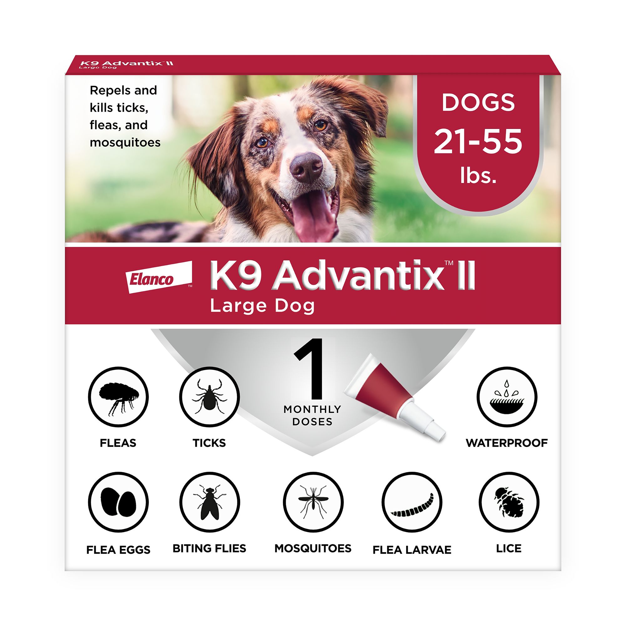Fleas, ticks, mosquitoes and other insects not only cause discomfort; they may also transmit disease. Monthly use of K9 Advantix II is important to protect your dog against fleas that may cause transmission of tapeworms. This formula also kills fleas which may cause Flea Allergy Dermatitis and flea bite anemia.