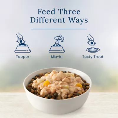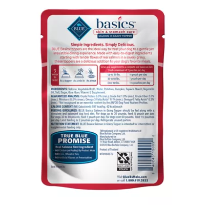 SINGLE ANIMAL PROTEIN SOURCE: BLUE Basics toppers feature a single protein source real salmon in a tender, flaky texture dogs love GENTLE DIGESTION: Among the simple ingredients in BLUE Basics toppers is pumpkin, which promotes gentle digestion THREE WAYS TO FEED: BLUE Basics toppers can be fed as a dry food topper, mixed into your dog's favorite dry food, or as a standalone savory treat NATURAL INGREDIENTS: BLUE Basics is made with the finest natural ingredients enhanced with vitamins and minerals. It contains NO chicken (or poultry) by-product meals, NO corn, wheat, or soy, and NO artificial flavors or preservatives Contains one (1) 2.5 oz. pouch of Basics Skin & Stomach Care Natural Wet Dog Food Topper, Salmon in Gravy