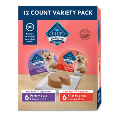 Give your small-breed dog the Porterhouse and Filet Mignon flavors they love with this Blue Buffalo Delights Wet Dog Food Variety Pack. Made with high-quality beef as the first ingredient, this natural dog food features some of their wholesome favorites, including potatoes, carrots, and peas. The perfectly portioned cups make mealtime easy. Serve this wet dog food pate for a balanced meal or mix it with dry food. And like all Blue Buffalo dog food recipes, this grain-free dog food contains no chicken (or poultry) by-product meals. It's also free of corn, wheat, soy, artificial flavors, and preservatives.