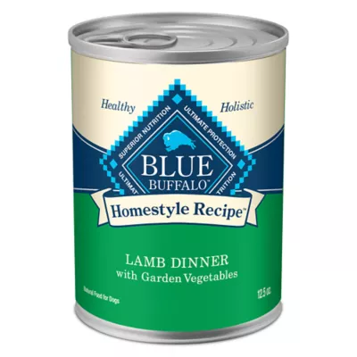 DESCRIPTION BLUE Homestyle Recipe Adult Wet Dog Food is made with real lamb as the first ingredient for flavor dogs love. This grain-free wet dog food also features tasty garden vegetables to give your dog a nutritious meal that tastes like home cooking. And like all Blue Buffalo dog food recipes, this wet dog food contains no chicken (or poultry) by-product meals. It's also free of corn, wheat, and soy. Watch your dog's tail wag when you open a can of Blue Buffalo Homestyle Recipe wet dog food.