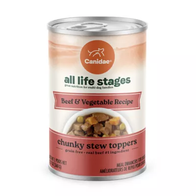 Canidae All Life Stages Chunky Stew Toppers Beef & Vegetable Recipe delivers mouthwatering flavor with hearty pieces of real meat and veggies in a savory broth. Made with real beef as the first ingredient, these stews add taste, variety, and hydration to your dog's bowl. Serve as a treat or kibble topper to plus up their diet with protein, fiber, and essential vitamins and minerals. These stews are uniquely formulated for dogs of all ages, breeds, and sizes. Canidae pet foods are nutritionally dense, nourishing your dog in every bite. Canidae was founded in 1996 and ever since has been committed to being good for pets and the planet. We carefully select ingredients and craft recipes that support your pet's whole body health. We nurture the health of our planet through our investment in regenerative agriculture and planet-friendly packaging.
