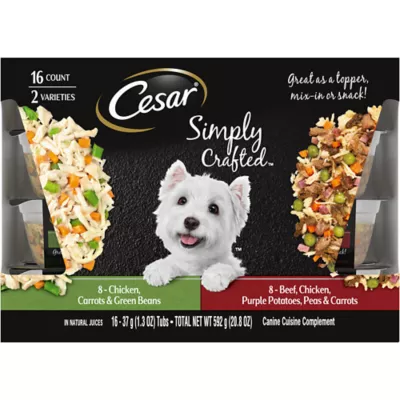 Made With Real Beef and Chicken: Cesar Simply Crafted Variety Pack is made with real beef or real chicken as the #1 ingredient with veggies.Delicious Topper: This great-tasting complement can be mixed with dry dog food, added as a topper, or enjoyed on its own as a snack.Easy-Peel Tray: Cesar Simply Crafted Wet Dog Food Complement Variety Pack comes with a handy peel-back seal that makes mealtime easy and flavorful.Made With Real Ingredients: This wet dog food topper is made with 5 key ingredients or less, providing your dog with a premium meal topper that is easy to digest, but hard for your dog to resist.Looks Delicious, Tastes Delicious: These single-serve wet dog food topper is slow-cooked for a great taste and freshness that dogs love.Quality Recipe: Made with high-quality, real meat, Cesar Simply Crafted wet dog food topper contains no by-products or artificial flavors; ingredients are natural as defined by the Association of American Feed Control Officials (AAFCO).Variety Pack: Contains sixteen (16) 1.3 oz. tubs of Cesar Simply Crafted Wet Dog Food Toppers: (8) Chicken, Carrots & Green Beans, and (8) Beef, Chicken, Purple Potatoes, Peas & CarrotsSpecies: Dog
