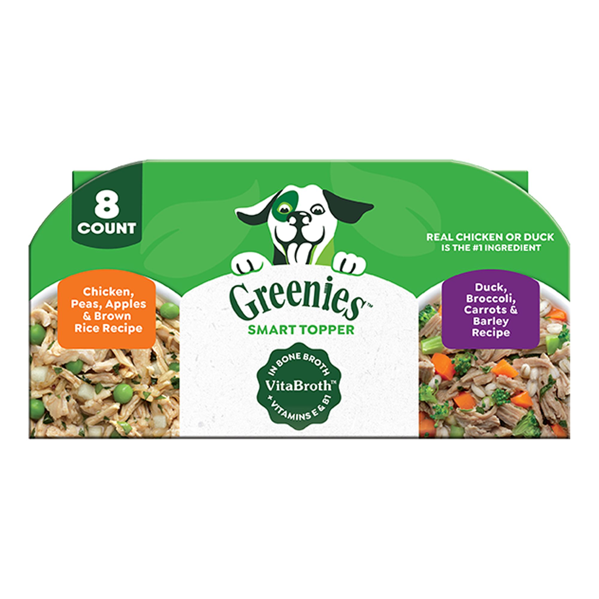 Contains: Four (4) 2 oz. trays of Greenies Smart Topper High Protein Wet Dog Food Complement, Chicken, Green Beans & Sweet Potatoes Recipe and four (4) 2 oz. trays of Greenies Smart Topper High Protein Wet Dog Food Complement Beef, Peas & Carrots Recipe both in Vitabroth