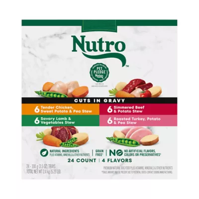 Tender Chicken, Sweet Potato & Pea Stew: Chicken, Chicken Broth, Pork Broth, Chicken Liver, Sweet Potatoes, Peas, Animal Plasma, Tapioca Starch, Pea Fiber, Potassium Chloride, Calcium Carbonate, Salt, Dried Tomatoes, Choline Chloride, Xanthan Gum, Sodium Acid Pyrophosphate, Tetrasodium Pyrophosphate, Magnesium Proteinate, Sodium Hexametaphosphate, Manganese Sulfate, Zinc Sulfate, Vitamin E Supplement, D-Calcium Pantothenate, Biotin, Copper Sulfate, Thiamine Mononitrate, Riboflavin Supplement, Potassium Iodide, Vitamin A Supplement, Pyridoxine Hydrochloride, Vitamin B12 Supplement, Vitamin D3 Supplement.