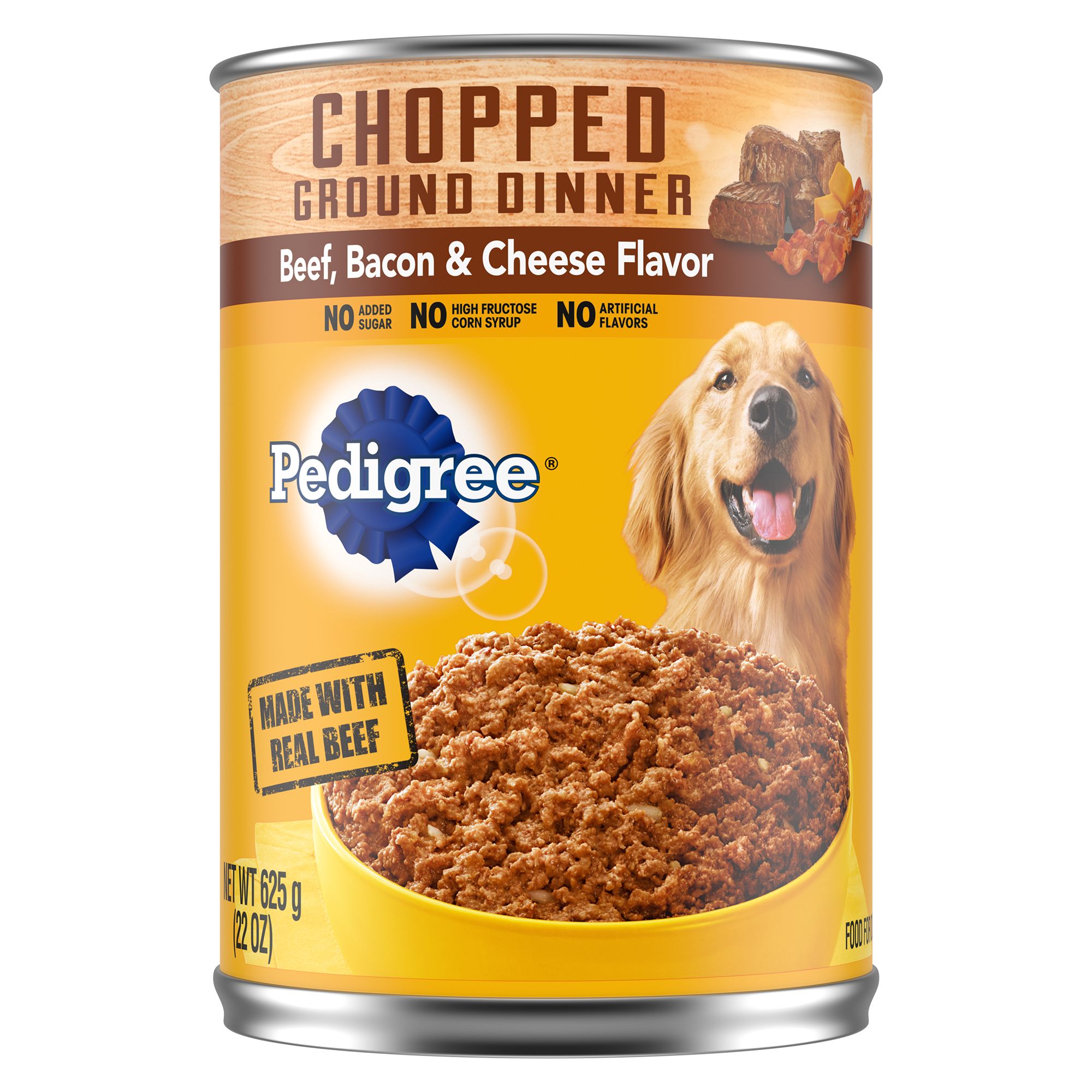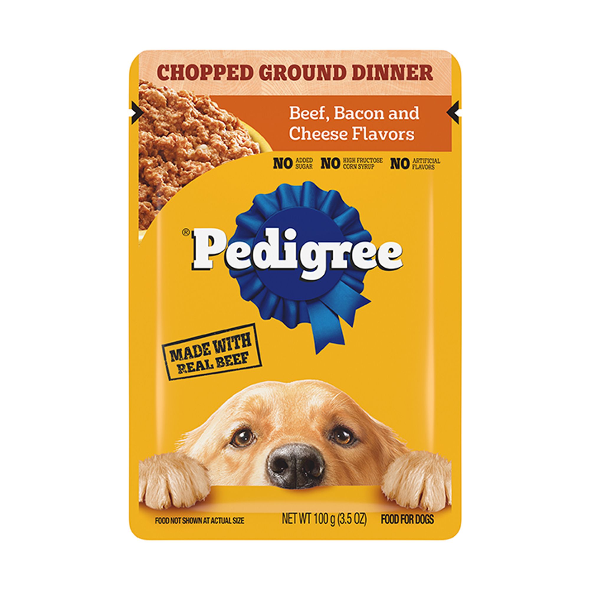 Description: Dogs bring out the good in us. Pedigree brings out the good in them. Express your love for your dog by serving Pedigree Chopped Ground Dinner Adult Soft Wet Dog Food Beef, Bacon & Cheese Flavor. This great–tasting wet dog food recipe is 100% complete and balanced for adult dogs and is slow–cooked with real beef, bringing a filling and familiar flavor to mealtime. Pedigree Chopped Ground Dinner recipes help support a healthy skin and coat. Made with 36 vitamins, minerals, and amino acids, Pedigree Chopped Ground Dinner supports your dog's everyday health. This versatile soft dog food leaves no messy leftovers and can be served as a topper, mixed with dry dog food, or enjoyed as a complete meal for adult dogs. This soft dog food recipe supports healthy digestion and contains 0% added sugar, artificial flavor, and high fructose corn syrup. The Pedigree brand has been supporting dog adoptions for 15 plus years and helping pet parents support their dogs with quality recipes. Pedigree Chopped Ground Dinner Adult Soft Wet Dog Food Beef, Bacon & Cheese Flavor shows your dog that you care and have great taste.