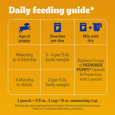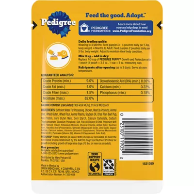 Formulated to help promote strong, healthy teeth and bones, PEDIGREE Puppy Morsels in Sauce with Chicken is the wet dog food specially designed to support growing puppies. Made with real ingredients including tasty chicken, your puppy will love this soft food as a treat, topper, as a mixer with dry puppy food, or a complete meal! Feed your puppy with confidence knowing that PEDIGREE dog food is made with DHA to help support brain development, and the necessary vitamins and minerals for a complete and balanced meal. With so many delicious flavors to choose from, PEDIGREE Puppy formulas are the great tasting way to give your precious new pup the nutrition they deserve.