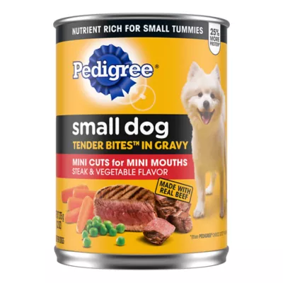 100% Complete and Balanced For Adult Dogs: Pedigree Small Dog Tender Bites In Gravy Wet Dog Food is 100% complete and balanced for adult dogs, providing the nutrients your dog needs.Quality Recipe: Pedigree Small Dog Tender Bites in Gravy Wet Dog Food Steak & Vegetable Flavor brings slow cooked, soft dog food recipes that are made with high quality animal protein to help support lean muscles.Mix–it–Up: Pedigree Small Dog Tender Bites In Gravy comes in an easy to open can, leaves no messy leftovers and can be served as a topper, mixed with dry dog food, or enjoyed as a complete meal for adult dogs on its own.Supports Total Health: This wet dog food supports everyday health with 36 vitamins, minerals and amino acids.Healthy Skin & Coat: Pedigree Small Dog Tender Bites In Gravy is crafted to help support a healthy skin and coat.Highly Digestible Recipe: This soft dog food supports healthy digestion for your canine companion.Contains: One (1) 13.2 oz. can of Pedigree Small Dog Tender Bites In Gravy Wet Dog Food, Steak & Vegetable Flavor.Species: Dog