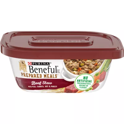 Give your dog a hearty meal with Purina Beneful Prepared Meals Beef Stew wet dog food. See a smile from him after every bite of this savory, high quality dog food with tender, meaty chunks, wholesome grains, veggies and flavorful dog food gravy. This thoughtfully crafted recipe is made with real beef to provide a source of high-quality protein that supports strong muscles. A blend of real veggies you can see, including peas and carrots, rice and barley helps create a delicious recipe that offers the nutrients he needs. This Purina Beneful wet dog food entree supplies 100 percent complete and balanced nutrition for adult dogs. Your dog is sure to love sinking his teeth into this prepared gravy dog food that contains no artificial colors, flavors or preservatives, and you can feel good about providing a meal that contains 23 essential vitamins and minerals. We package each recipe in a recloseable dog food tub to make it easy to store leftovers. Serve this beef stew dog food as a meal, or mix it with his favorite dry kibble. When you feed him Beneful Prepared Meals Beef Stew wet dog food, he just might think he's eating right off your plate, while you know you're caring for his every need.